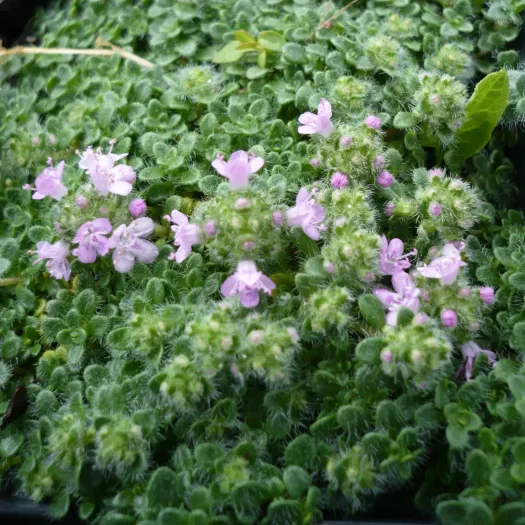 Le thym rampant est une petite plante vivace d'environ 3 cm de hauteur. Ses petites fleurs roses en été contrastent avec son feuillage très serré et d’aspect laineux. C'est un des rares thyms à ne pas avoir d'odeur.Multiplication :
